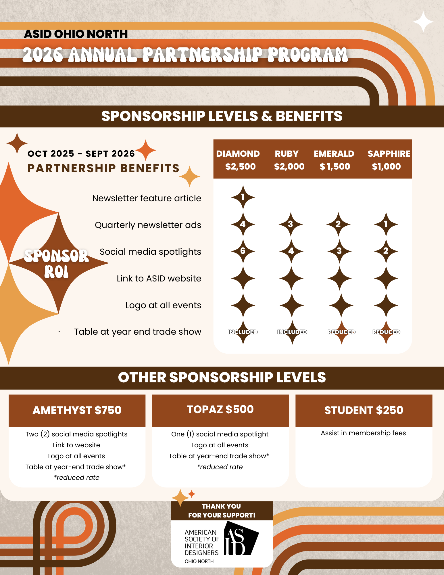 ASID Ohio North Chapter appreciates your support and commitment to our local interior designers. By becoming a support partner of ASID Ohio North, your sponsorship will help to support at a local level, which in turn, helps our membership and keeps us operating successfully.